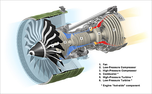 Prerez in fotografija sodobnega visoko obvodnega (high bypass) turboventlatorskega letalskega motorja GE90 brez zunanjega ohišja. Zaradi velikega zračnega toka ob izgorevalnem delu ti motorji generirajo veliko hladnejše izpuhe…