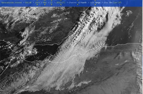 - Spremljanje satelitskih posnetkov oblačnosti kaže, da se ob ciklonih vedno večkrat pojavlja značilna urejena in ponavljajoča se nenaravna razporeditev oblakov v ravnih "valovih". Medsebojen razmik približno 1 do 10 km odgovarja oddajanju v frekvenčnem območju dolgih radijskih valov, ki je za radijske prenose že precej opuščeno, s frekvencami od 300 in navzdol do 30 kiloherzov. Nam pa to omogoča, da s starejšimi sprejemniki in močnim šumenjem posameznih kanalov odkrijemo takšno EM valovanje nad nami…