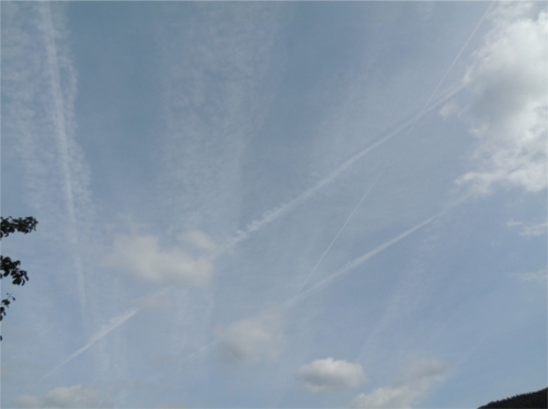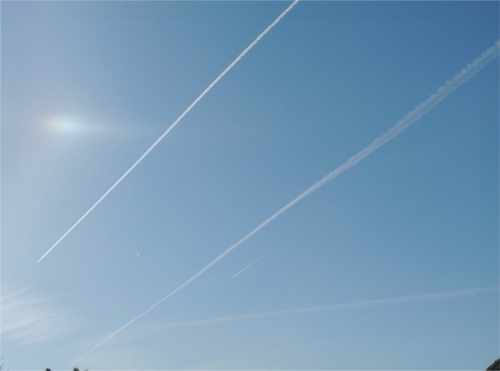 Različne kratke in dolge sledi v ozračju, nasičenem z delci jutranjega pršenja in posledičnim sončnim halo učinkom. Takšnih posnetkov je samo v Sloveniji gotovo na tisoče, samo iz njih se moramo naučiti tudi pravilnega razbiranja situacije…