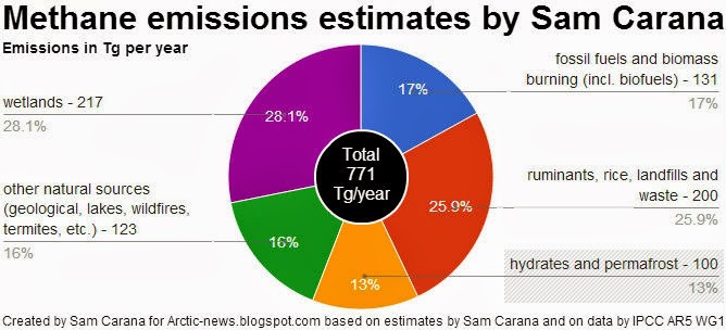 Najnevarnejši toplogredni plin je metan, to je najlažja komponenta zemeljskega plina, ki se lahko dvigne v ozračje. Rusija je največja proizvajalka zemeljskega plina in črpališča plina so v najsevernejših delih Evrope in zahodne Sibirije, že v tundri kjer je vrhnja plast zemlje več metrov globoko stalno zamrznjena (permafrost) in je do sedaj kljub velikim pritiskom v notranjosti zadrževala ta zemeljski plin. Vendar segrevanje Zemlje ima največji učinek proti obema poloma, ker enostavno presežek energije teče vedno tja, kjer je je najmanj. Tam se temperatura glede na naravno ravnovesje najbolj povečuje. To segrevanje počasi tali permafrost in metan najprej najde pot na površje. To isto se dogaja na morskem dnu, ki ga mehča segrevajoči se ocean. Na začetku so bile to majhne luknje, kjer je človek lahko prižgal plamen in si skuhal čaj, mehurčki iz poleti odtaljenih jezerc, danes pa so se začeli dogajati tudi že veliki izbruhi plina, ki naredijo nekaj 10 do nekaj 100 metrov velike kraterje. Nihče ne ve, koliko plina uide skozi tako luknjo, preden se material posede nazaj in v kraterju nastane jezero. Sprostitev zalog metana, ki so pod zemljo bo z ekstremnim učinkom segrevanja planeta ukrivila spiralo propadanja življenja na Zemlji strmo navzdol.