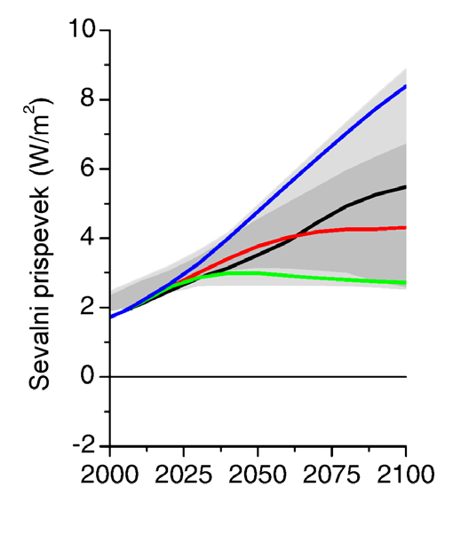 Slika 1. Značilni poteki vsebnosti toplogrednih plinov (RCP). Zelena: RCP2.6, rdeča: RCP4.5, črna: RCP6 in modra: RCP8.5. Številka izraža neto sevalni prispevek konec 21. stoletja.