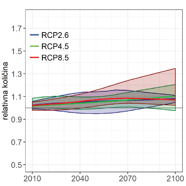 Slika 5. Časovni potek kazalnika višine padavin glede na primerjalno obdobje 1981–2010 za Slovenijo na letni ravni za tri scenarije. Debele črte prikazujejo glajen signal, ovojnice pa razpon negotovosti.