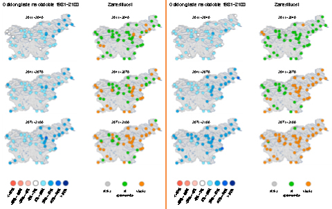 Slika 7. Spremembe srednjih letnih konic pretoka (sQvk) slovenskih rek za zmerno optimistični (levo) in pesimistični (desno) scenarij. V levem stolpcu vsakega scenarija je srednja vrednost povečanja, v desnem pa značilnosti teh sprememb. Z zeleno je označeno, da spremembe ni, z oranžno, da je sprememba zanesljiva in s sivo, da sprememba ni zanesljiva, odvisna je od podnebnega modela.