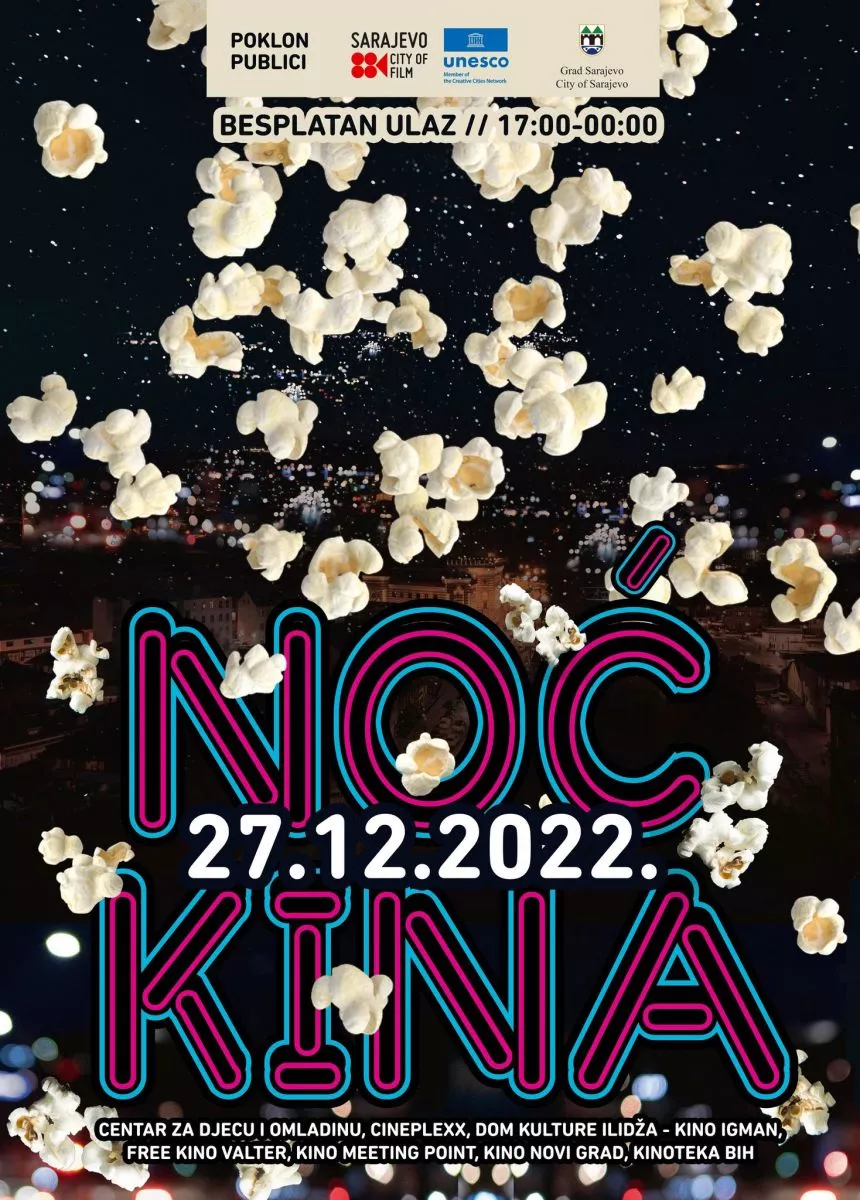 Na Noć kina, 27. decembra, od 17 sati do ponoći, publika će moći uživati u besplatnim programima u kinima u Sarajevu: u kinu Meeting Point, Kinoteci BiH, Centru za omladinu i djecu – Grbavica, u Domu kulture Ilidža – kinu Igman, kinu Novi Grad, Free Kinu Valter i Cineplexxu Sarajevo.