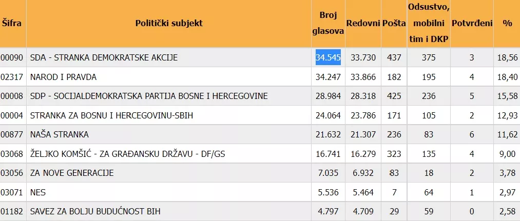 SARAJEVO, (Patria) - Nakon novog presjeka glasova koji je objavila Centralna izborna komisija, a koji uključuju glasove pristigle poštom poredak stranaka u Kantonu Sarajevo se promijenio. U vodstvo je prešla SDA sa 34.545, a drugi je NIP sa 34.247 glasova. SDP je ubjedljivo na trećem mjestu sa 28.984 glasova, a četvrta je Stranka za BiH sa 24.064 glasa.