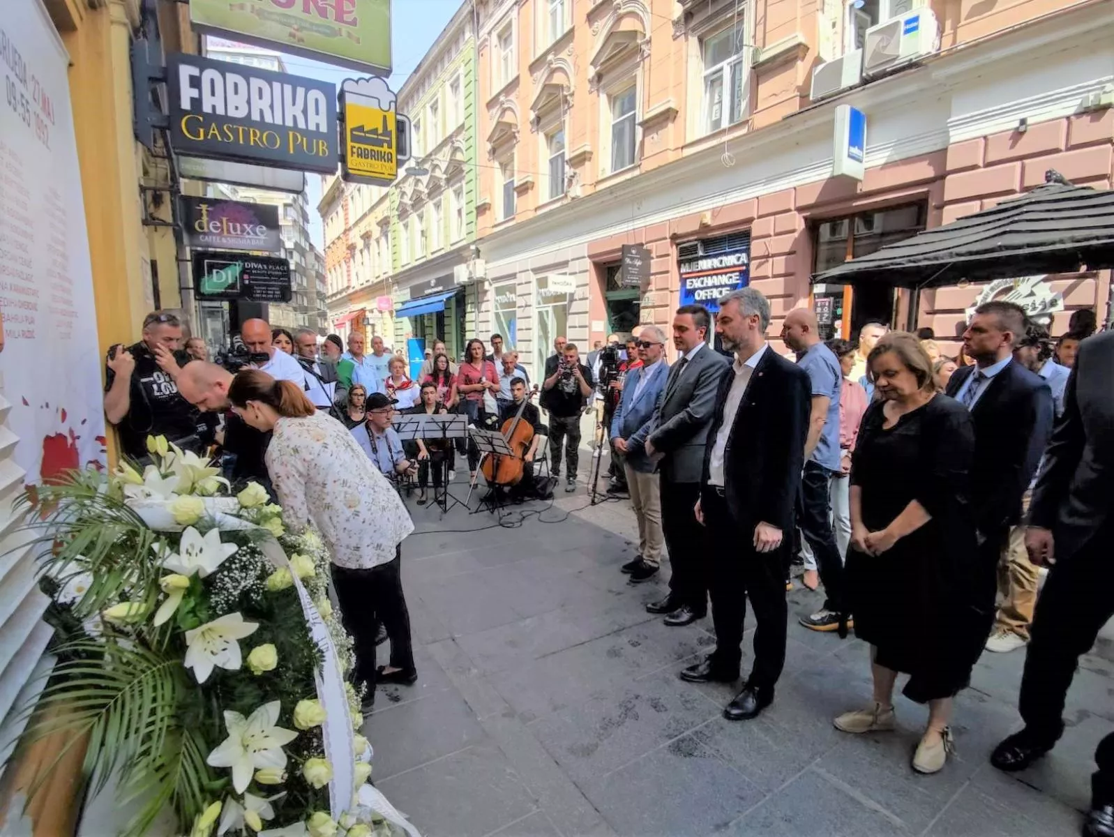 (Patria) - Na mjestu masakra u ulici Ferhadija (bivša Vase Miskina) danas su brojne delegacije odale počast i položile cvijeće na mjestu stradanja 22 civila i 108 ranjenih 27. maja 1992. godine.