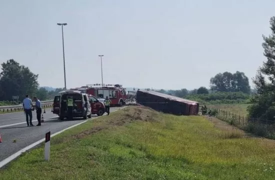 Policija je oko 6,20 sati dobila dojavu da se na autocesti kod Slavonskog Broda, u blizini naplatnih kućica na južnom kolničkom traku dogodila prometna nesreća u kojoj je došlo do slijetanja autobusa makedonskih nacionalnih oznaka.
