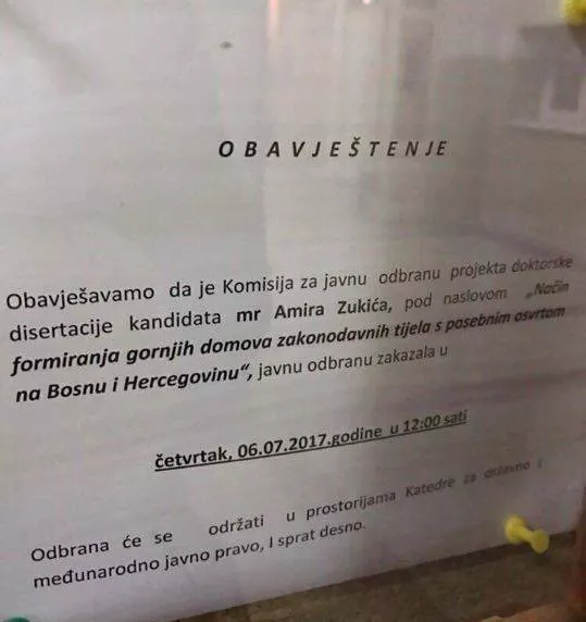 Odbrana doktorske disertacije „Način formiranja gornjih domova zakonodavnih tijela s posebnim osvrtom na Bosnu i Hercegovinu“ trebala bi biti održana 6. jula 2017. godine.
