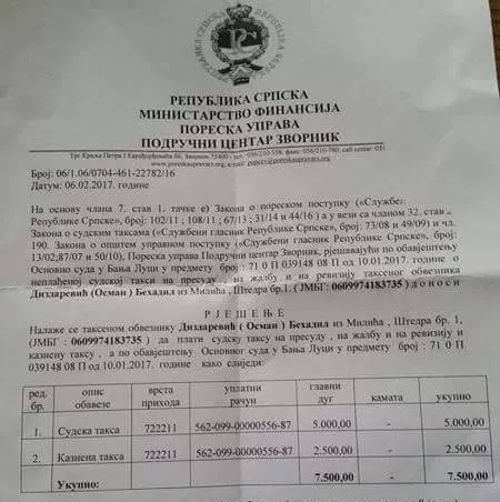 Prvo mu je na kućnu adresu u januaru stiglo rješenje, na koje nema pravo žalbe, da plati 5.000 KM sudske takse i 2.625 KM troškova postupka. Šestog februara ponovo je zakucao na vrata poštar.