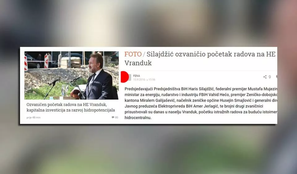 Prije šest godina početak radova na gradnji HE Vranduk ozvaničio je tadašnji predsjedavajući Predsjedništva BiH Haris Silajdžić.Tada je rečeno da će izgradnja protočne HE Vranduk instalirane snage oko 20 megavata, trajati oko četiri godine.