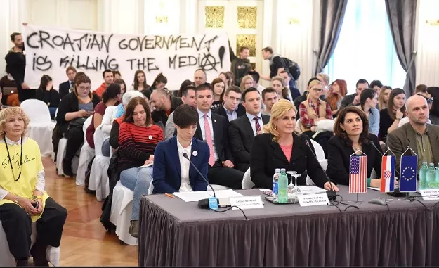 Dio aktivista Radničke fronte podigao je natpis "Croatian goverment is killing the media" upravo za vrijeme govora predsjednice Grabar Kitarović. Dio novinara i aktivista nakon što je izviždao predsjednicu napustio je veliku dvoranu HND-a gdje se održavala konferencija.