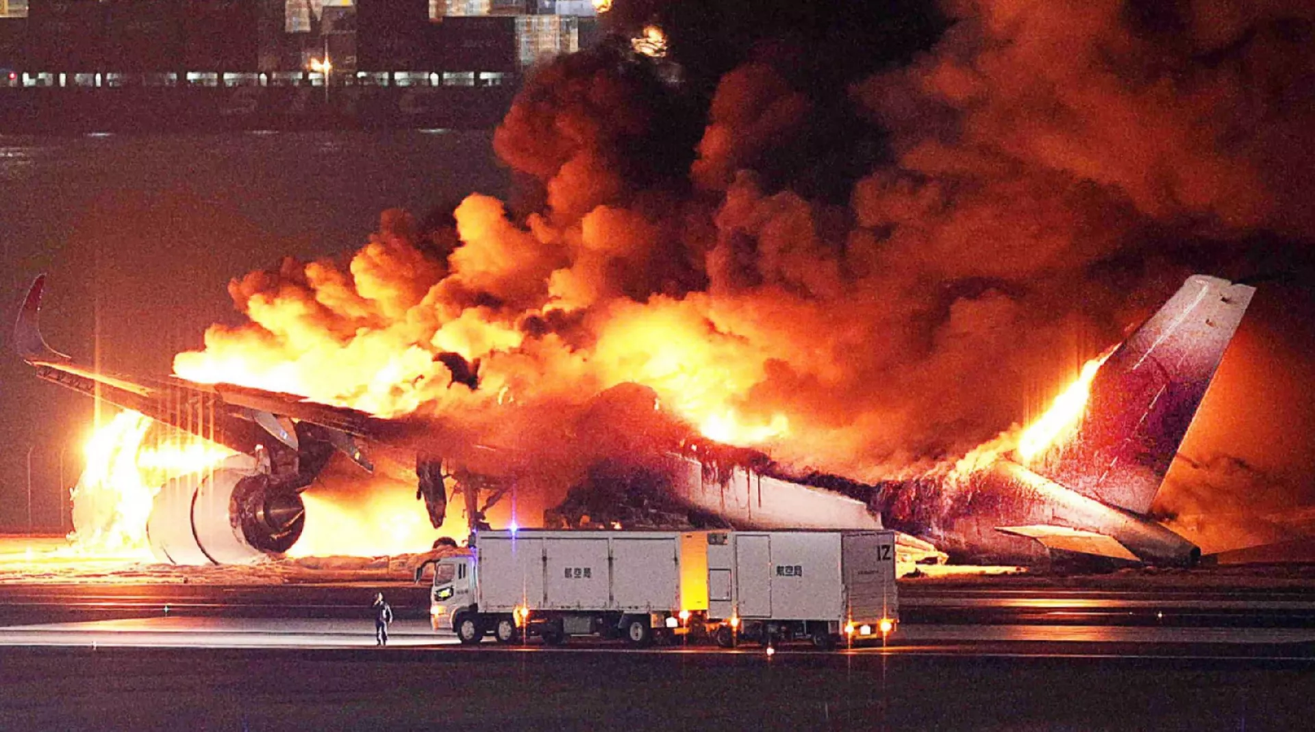 Snimci televizije NHK pokazuju kako vatra izlazi iz prozora jedne letjelice i ispod nje.