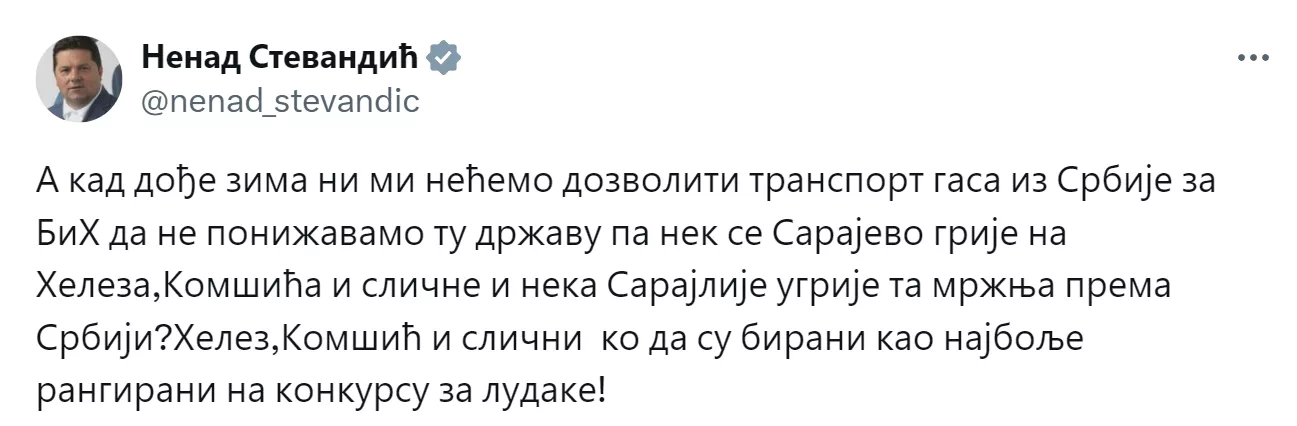 - A kad dođe zima, ni mi nećemo dozvoliti transport gasa iz Srbije za BiH da ne ponižavamo tu državu, pa neka se Sarajevo grije na Heleza, Komšića i slične - naveo je Stevandić na platformi X.