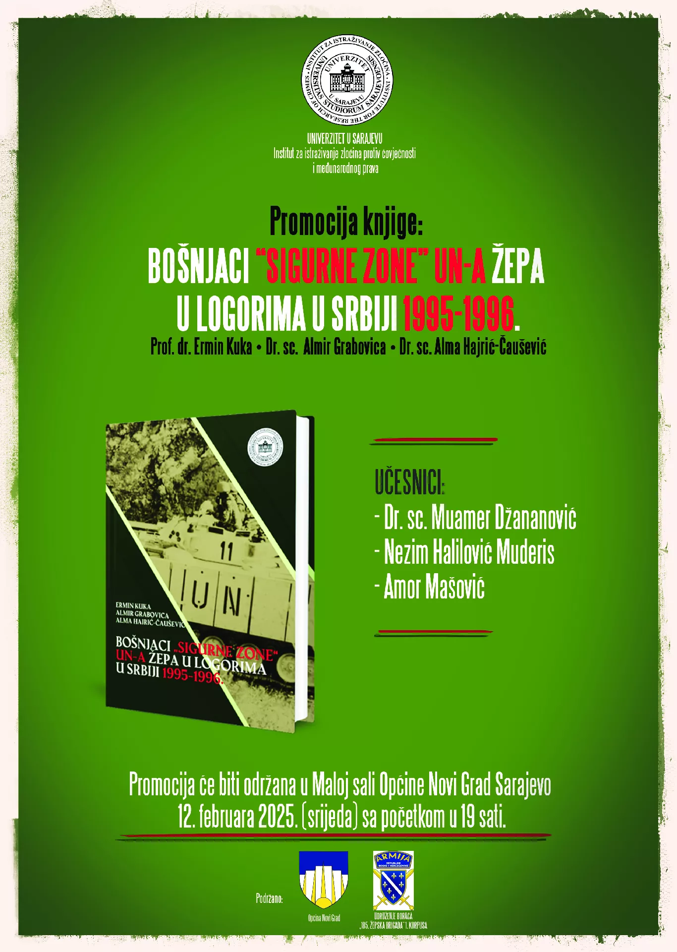 (Patria) - "Bošnjaci 'sigurne zone' UN-a Žepa u logorima u Srbiji 1995-1996.", naziv je knjige autora prof. dr. Ermina Kuke, dr. sci. Almira Grabovice i dr. sci. Alme Hajrić-Čaušević čija će promocija biti održana u srijedu, 12. februara u Maloj sali Općine Novi Grad Sarajevo, s početkom u 19 sati.