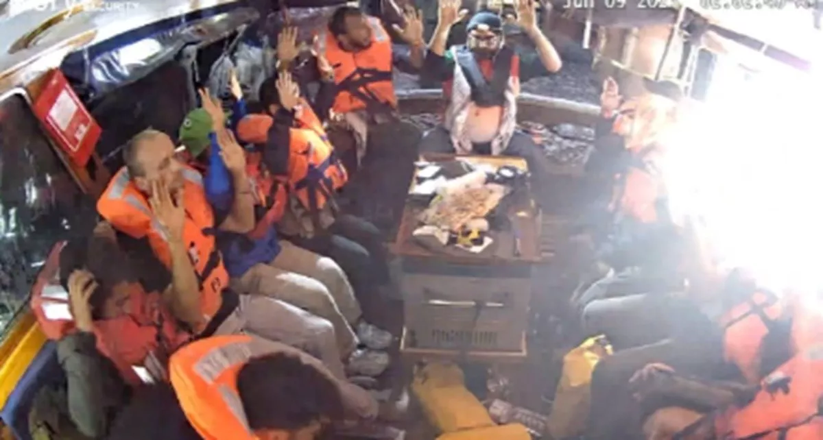 FFC je na Telegramu objavio i video na kojem se vidi kako članovi posade sjede u unutrašnjosti broda s podignutim rukama.