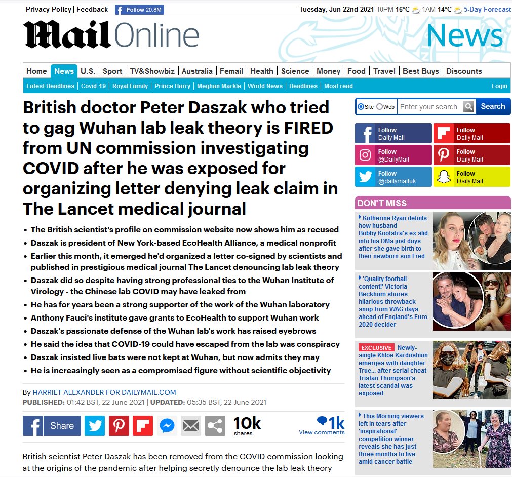 Vendar so nekateri vpletenost laboratorija Wuhan hitro zavrnili kot"teorijo zarote". Laboratorij je, podobno kot kitajsko vodstvo, vztrajal, da mora biti vir okužbe wuhanska tržnica z divjimi živalmi. Čeprav je bil prvi potrjeni primer COVID-19 v Wuhanu oseba, ki ni imela nobene povezave s tržnico z morsko hrano v Huananu, so kitajski uradniki hitro okrivili tržnico, kar je tudi Svetovna zdravstvena organizacija vneto ponavljala.