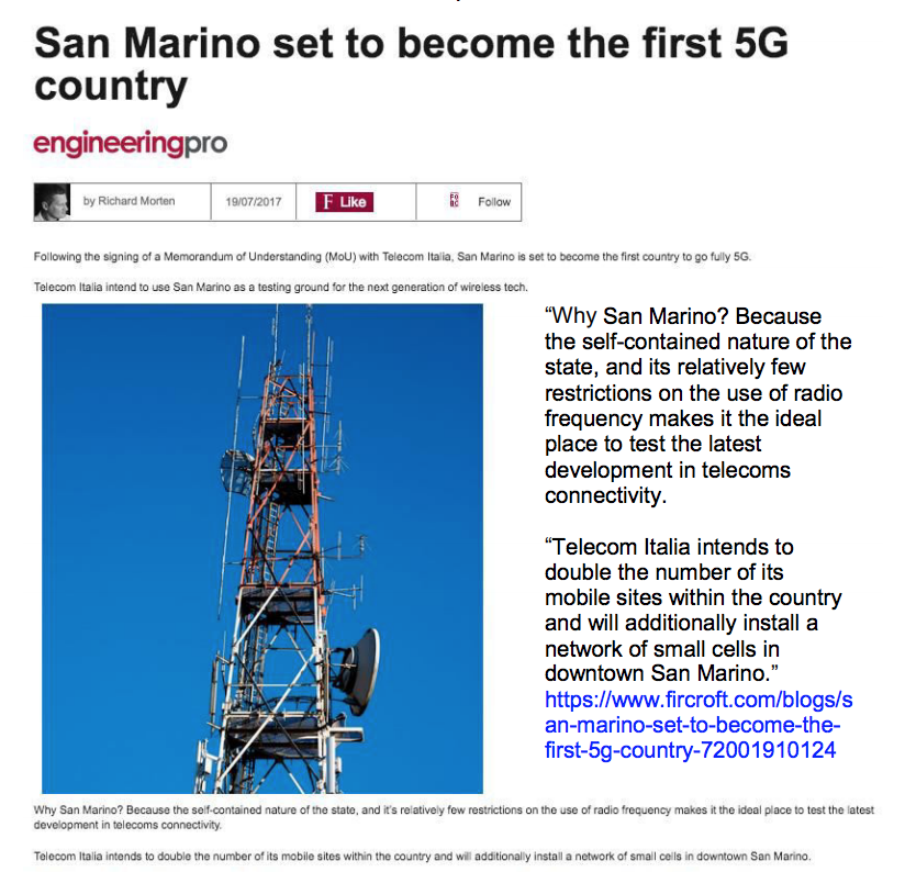 "Zakaj 5G v San Marinu? Ker samostojna narava države in njene razmeroma majhne omejitve uporabe radijskih frekvenc omogočajo idealno mesto za preizkus najnovejšega razvoja telekomunikacijske povezljivosti. "Telecom Italia namerava podvojiti število svojih mobilnih točk v državi in bo dodatno namestil mrežo majhnih celic 5G v centru San Marina." https://www.fircroft.com/blogs/s%20an-marino-set-to-become-the-%20first-5g-country-72001910124