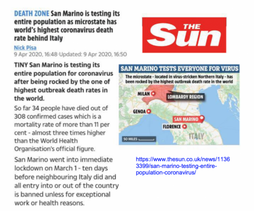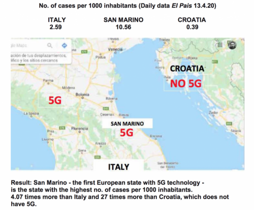 (c) Primer San Marina je zelo pomemben. Nahaja se znotraj italijanskega ozemlja, s podobno kulturo, gospodarstvom in socialno stopnjo, vendar ima veliko višje stopnje okužbe. Edina razlika je čas izpostavljenosti njenih državljanov sevanju 5G, ker je bil San Marino 4. septembra 2018 prva država na svetu, ki je uvedla 5G tehnologijo, v Italiji pa jo uvedli 5. junija 2019. To odpira vrata za razpravo o verjetnem vplivu 5G na povečanje stopnje okužbe v San Marinu. Pr = 1/194 x 1/194. Verjetnost je 1proti 37.636.