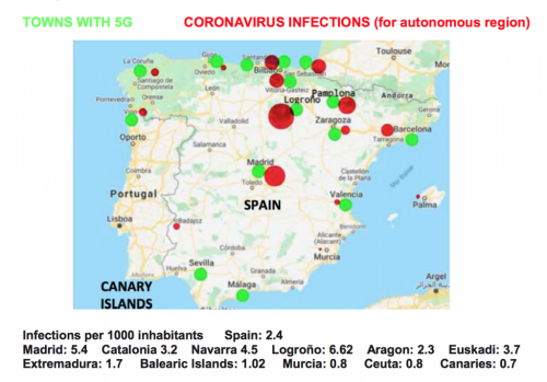 Podatki za mesta s 5G bi morali biti povezani s številom okužb v teh mestih. Ker podatki po mestih niso na voljo, je bila primerjava narejena s podatki za avtonomne regije. Zaradi tega se podatki prestolnic razredčijo s podatki iz njihove regije. Zato je primerjava v avtonomnih regijah z eno ali dvema pokrajinama pomembnejša: Extremadura, Murcia, Madrid, Navarra, Rioja, Balearski otoki, Asturija ali Kanarski otoki. Tudi v Euskadi, saj imajo tri glavna mesta 5G.