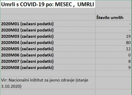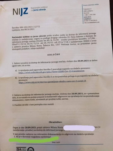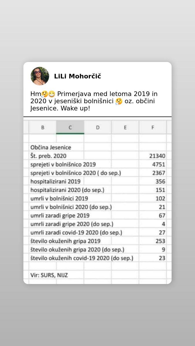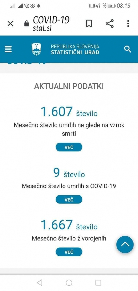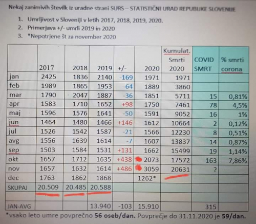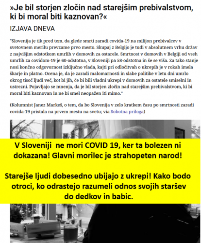 Trenutna številka umrlih v Sloveniji, po sedmih mesecih COVIDA je 0,0085 procenta populacije (z, s, zaradi, ob, med nad in kaj vem kakšno definicijo vred, vse skupaj)!!!! Pravijo, da bi se naj nestrokovnjaki ne vmešavali v medicinsko stroko. Obrnimo zadevo; preživelo je 99,9915 procenta populacije!!! Mislim, da je čas, da se medicisnki strokovnjaki prenehajo vmešavati v 99,9915 procenta življenja, ker ga ne razumejo.