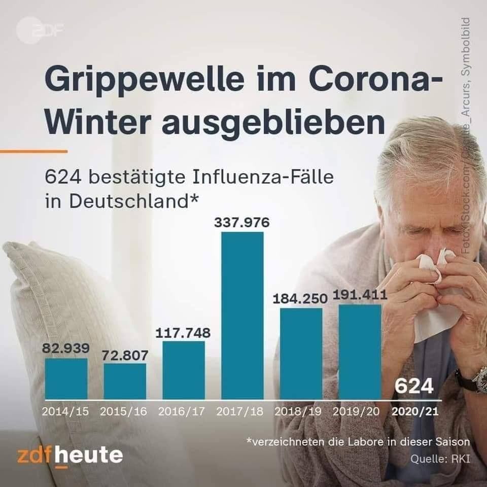 V Nemčiji je v sezoni 2020/21 zaradi gripe umrlo 411 ljudi. Pred dvemi leti je zaradi gripe še vedno umrlo 25.100. Je komu jasno, kaj se je zgodilo?