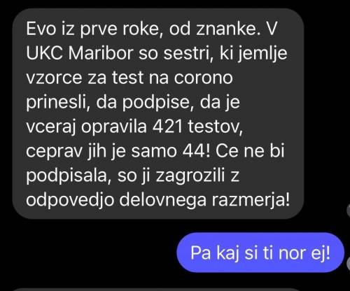 Snaha mi je danes povedala, da jo je sinoči klicala prijateljica, ki je bila z otrokom na urgenci zaradi padca. Nista bila testirana, vendar je čez 2 uri prejela sms da sta covid pozitivna. Ja, tako pa lahko nastane veliko število testirancev in pozitivnih, kar tako