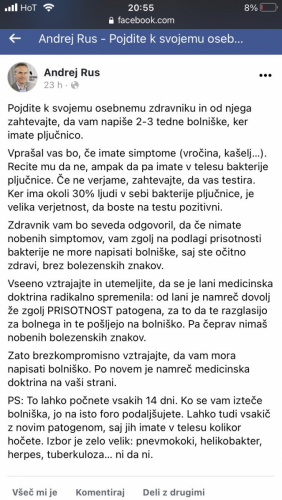 Na spletu se je pojavil video posnetek očeta malčka iz Izole, ki naj bi bil v sredo po rednem programu cepljen proti ošpicam, mumpsu in rdečkam. Ker je otrok naslednji dan imel povišano telesno temperaturo, so o tem starši poklicali v zdravstveni dom Koper, kjer se jim je oglasila dežurna pediatrinja. Sledil je šok, saj naj bi zdravnica odgovorila, da bo otroka zavedla v evidenco okuženih s covid-19. Ker naj bi bil malček nato čisto zdrav, se mnogi sprašujejo o verodostojnosti številk okuženih, s katerimi nam vsak dan postreže država. Na njegovo objavo so se vsuli številni komentarji, v katerih so uporabniki začeli dvomiti v verodostojnost števila okuženih v Sloveniji, če drži, da okužbe s covid-19 ocenjujejo tudi na tak način.