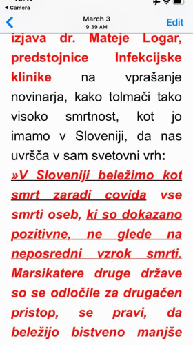 Dr. Mateja Logar s Klinike za infekcijske bolezni in vročinska stanja pri UKC Ljubljana Na vprašanje, kaj je vzrok, da je v Sloveniji toliko smrtnih žrtev, je dr. Logarjeva odgovorila: “V Sloveniji beležimo kot smrt zaradi covida vse smrti pri osebah, ki so dokazano pozitivne, ne glede na vzrok smrti.