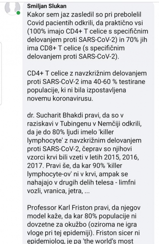 Priznana avtoriteta na področju medicine, British Medical Journal, je v preteklih dneh predstavil precej revolucionarne izsledke … Vsaj šest različnih študij je v zadnjem času pokazalo na prisotnost T-celic oz. protiteles virusu SARS-CoV-2 pri 20 do 50 odstotkih ljudi, ki niso bili v stiku z virusom. Podobne celice so bile opažene že v krvi darovalcev, ki so svojo kri v ZDA darovali med leti 2015 in 2018, študijo pa so izvedli tudi na Nizozemskem in ugotovili, da T-celice vsebuje »predpandemijska« kri kar dveh od desetih ljudi. Tudi v Nemčiji so T-celice našli pri tretjini darovalcev, ki niso bili v stiku z okužbo, podobni izsledki pa prihajajo še iz Singapurja, Velike Britanije in Švedske.