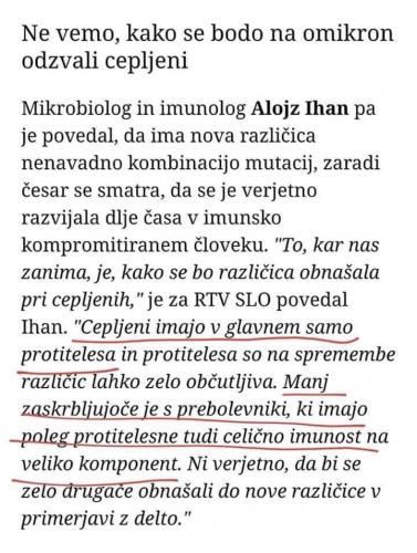 Dr. Alojz Ihan: prebolevniki z naravno imunostjo so bolje zaščiteni pred Omicron različico kot cepljeni, ker imajo odportnost na več komponent koronavirusa: 30.11. 2021