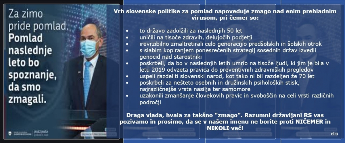 Poziv izraža kritiko ravnanja vlade v času epidemije covid-19. Kriza zaradi epidemije bi zahtevala predano strokovno delovanje politike za njeno reševanje, ne pa zlorabo epidemije za uvajanje avtokracije. Skrajno neodgovorno in za družbo škodljivo je, da vlada sedanje stanje izrablja za uveljavljanje svoje ozke politične agende, strankarsko kadrovanje, privatizacijo družbenih dejavnosti in državnega premoženja, razgrajevanje socialne države, koruptivne posle z zdravstveno opremo, zlorabo javnega denarja, podrejanje policije, uničevanje javne RTV ter napade na medije, civilno družbo in vse drugače misleče. To se mora nehati!