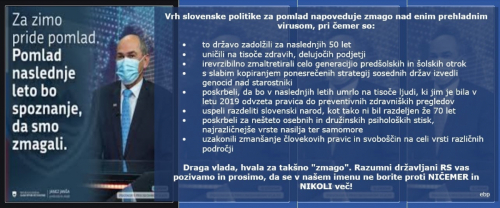 Zato zahtevamo takojšnje odprtje in delovanje vrtcev in osnovnih šol v Sloveniji, brez uporabe škodljivih mask, ki otrokom v rasti in razvoju otežujejo dihanje in lahko vodijo v bolezenska stanja, ki bodo mnogo hujša, kot morebitna pozitivnost na test enega ali več od 300.000 aktivnih virusov.