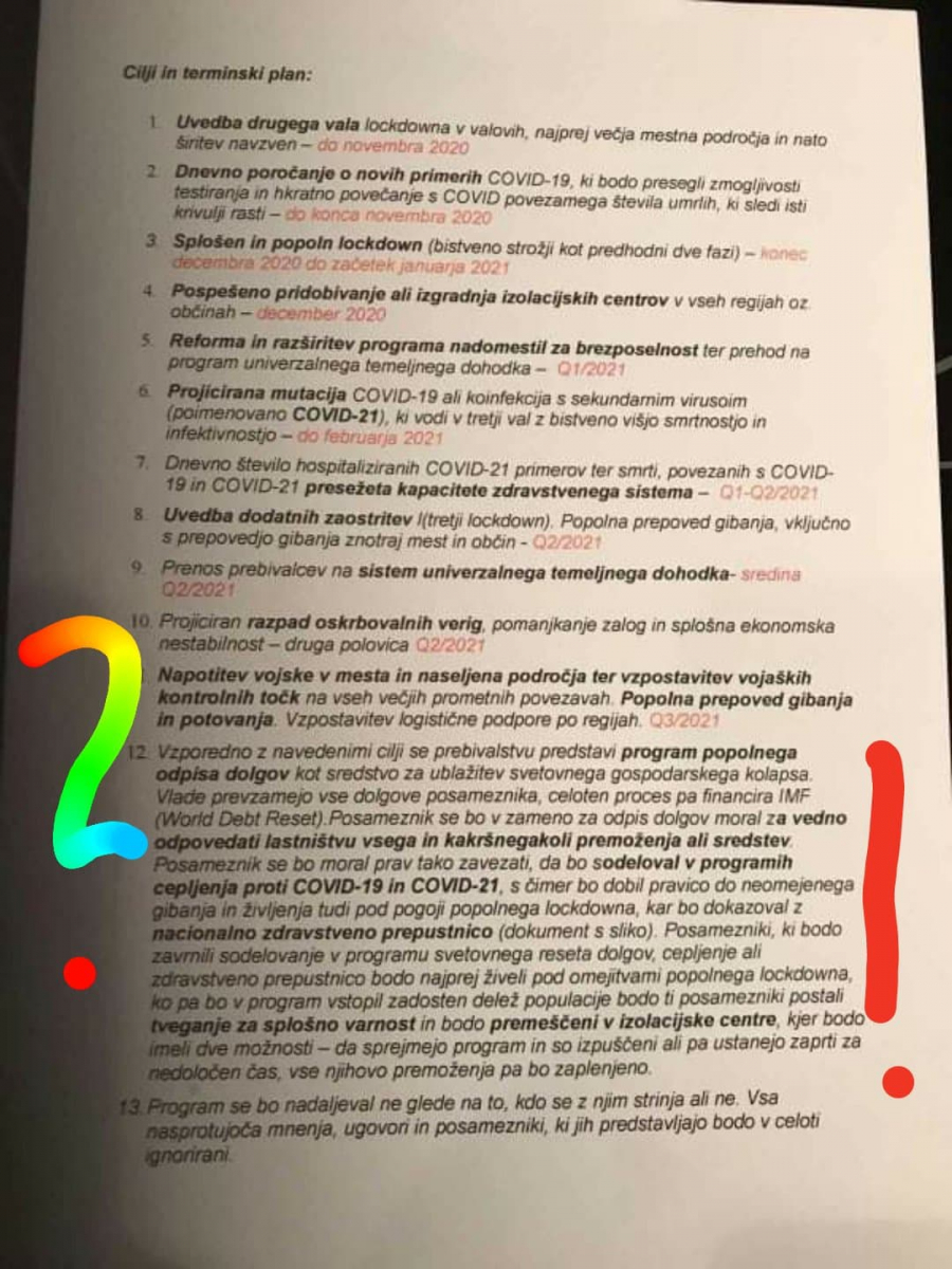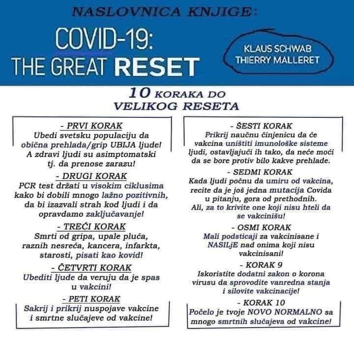 - pod krinko pandemije koronavirusa tehnokrati globalisti uvajajo The Great Reset: Svetovni ekonomski forum iz Davosa 2020 sporoča, da do leta 2030 ljudje ne bodo imeli več zasebne lastnine, obstajala bo ena svetovna vlada, ki bo določala, kako boste vi živeli, kam boste lahko potovali, kaj boste lahko jedli in katera cepiva boste morali prejeti