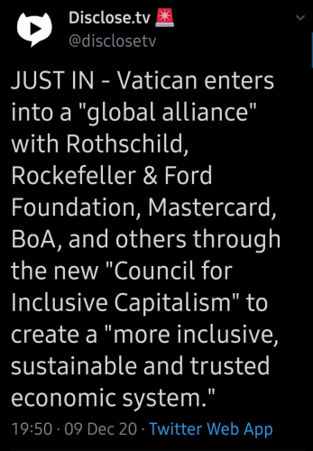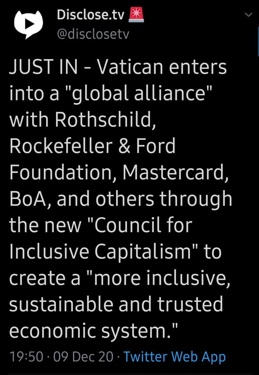 - Ta ekipa na čelu s Sorosem, Claus Schwabom iz Svetovnega gospodarskega foruma, Lord Malloch Brownom, svetovalcem Bidena in drugimi globalisti sprovajajo NWO tehnokracijo in digitalno diktaturo The Great Reset. Vatikan in Jezuiti s Papežem Frančiškom pri tem podpirajo Soroševe migracije, novo obliko komunizma NWO, LGTB, uničevanje družine, vzgojo otrok ne v družini ampak v širši družbi (socialni centri ki odvzemajo otroke staršem). Konzervativni katoliški krogi se upirajo temu in nasprotujejo Papeževim neo liberalnim globalističnim NWO načrtom in so bližje nacionalnim suverenistom, kot so npr. ameriški republikanci. Vatikan je duhovni center Novega Svetovnega reda in The Great Reset in naslednik globalizma Svetega Rimskega Cesarstva v sodelovanju z Germani. Zdaj je Vatikan sklenil zavezništvo z Rothchildsi za prenovo kapitalizma, pod krinko bolj pravične družbe - The Council for Inclusive Capitalism