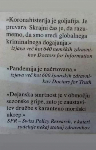 Pandemija je projekt evgenikov za depopulacijo, kar je povedal evgenik Kissinger leta 2009 pred pandemijo svinjske gripe:... čreda nam bo sama plačala cepiva za iztrebljanje. To ni teorija zarote temveč zarota v praksi. V NASA dokumentu je že leta 2001 bila napoved pandemije in cepivo za gensko spremembo človeške rase. Ukinjao ustavne pravice in človekove svoboščine pod izgovorom zaščite zdravja. Cepljenju sledi čipiranje za nadzor prebivalstva in spremembo sistema.