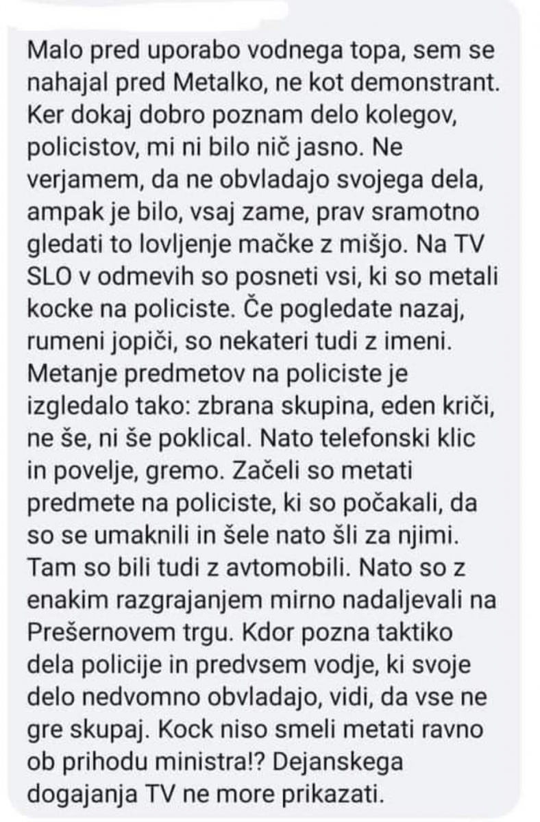 ter na podlagi dostopnega (video) materiala iz družbenega omrežja ter medijev, je možno ugotoviti številna neskladja in interpretacije istega dogodka glede ukazov, ki jih je operativni štab Policije odredil policistom, ki so tega dne v Ljubljani opravljali delo.