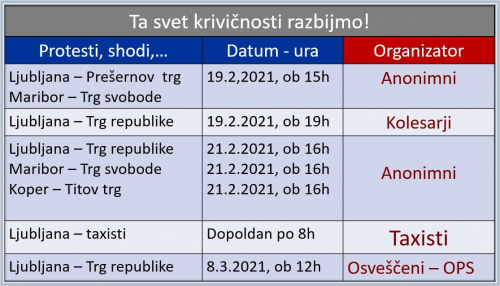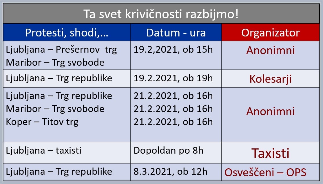 Ne glede na to, da se vsak petek odvija (dne 8.10. 2021 že 77.) miren protest proti sedanji oblasti, le-ta očitno protestov ne jemlje kot ustavno in mednarodno zagotovljeno pravico državljanov do javnega izražanja svojih mnenj in kritike ter spontanega zbiranja in jim ne prisluhne, temveč v njih vidi oviro svojih ciljev in delovanja. Zato so se t.im. petkovim protestom pridružili še protesti ob sredah v Ljubljani ter protesti po drugih krajih v Sloveniji, v Mariboru, Izoli, Trbovljah, Marezigah.. .