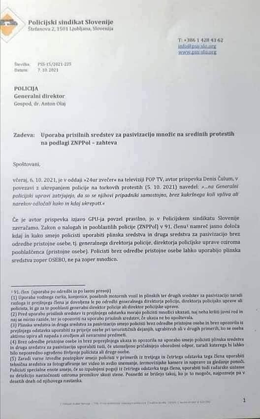 V zadnjih tednih, ko se vrstijo spontani protesti po Sloveniji proti oblasti in njenim, pogosto povsem neutemeljenim ukrepom iz številnih odlokov, največkrat sprejetih kar na dopisnih sejah vlade, je policija v več primerih v Ljubljani uporabila plinska sredstva – solzivec, plinske naboje, vodni top, konjenico, policijske pse. Ta zadnji primer, dne 5. oktobra 2021 pa prav vsa navedena sredstva. Glede na okoliščine, ki jih ugotavljamo z neposredno prisotnostjo, ter z objavami pisnih in slikovnih posnetkov novinarjev ter spletnih omrežij, obstaja utemeljen dvom v upravičenost aktivacije 9. člena Zakona o nalogah in pooblastilih policije. Prvič sploh je policija s sugeriranjem naznanjenih aktivirala to določbo, na podlagi katere se lahko zaradi velike verjetnosti hujše kršitve javnega reda omeji ali prepove gibanje na določenih območjih, določenih krajih ali javnih mestih. Sklep je očitno nesorazmeren zaradi njegove širine in nedoločenosti, zato je bila tudi njegova (neomejena) uporaba nesorazmerna in neutemeljena.