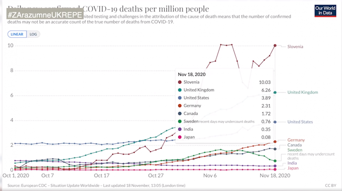 Slovenija vodi po številu umrlih (10,03) na 1 milijon prebivalcev pred veliko Britanijo, ZDA, Nemčijo, Kanado in Švedsko (0,76), kjer ni ukrepov, ki jim imamo v Sloveniji, kjer smo praktično zaprti in imamo policijsko uro
