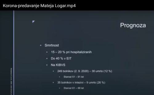 Smrtnost zaradi COVID-19 je v Sloveniji po podatkih do septembra 2020 bila pri 15-20% hospitaliziranih bolnikih, do 40% pri bolnikih na intenzivni negi. Do 2.9. 2020 je bilo hospitaliziranih 249 bolnikov, umrlo jih je 30 (12%), 35 bolnikov je bilo na intenzivni negi, od tega jih je 9 umrlo (26%), v starostnem razredu med 61-88 let