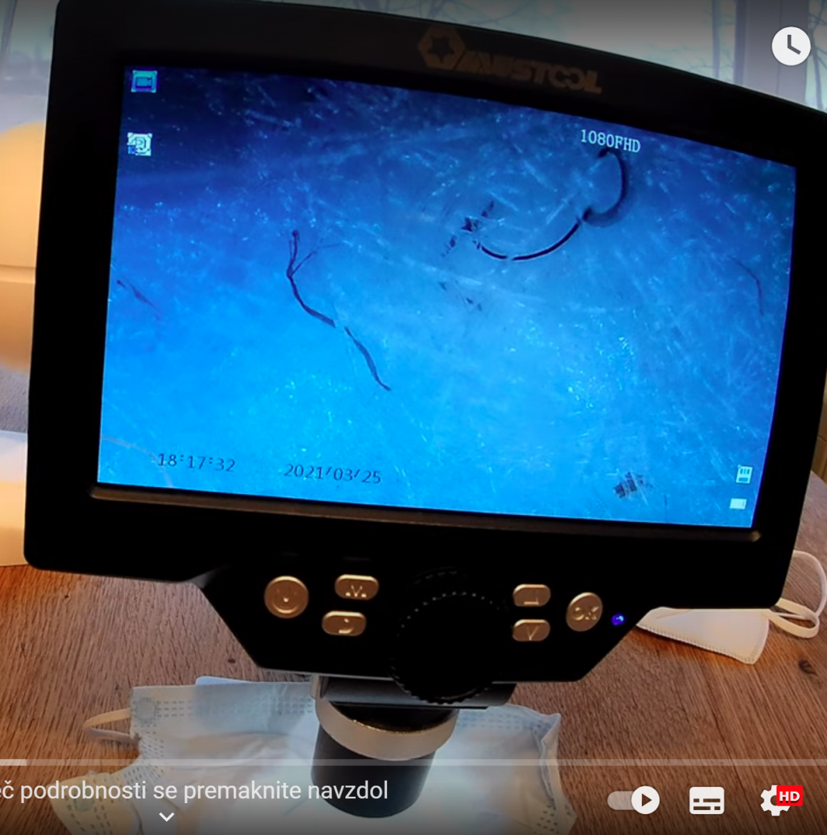 Morgellon biološki nanorobotski parazit na FFP2 maski, posnet z mikroskopom dne 25.3. 2021