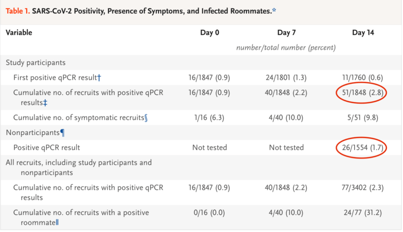No national news story that I have found highlighted the most important finding of all: extreme quarantine plus frequent testing and isolation among military recruits did nothing to stop the virus.