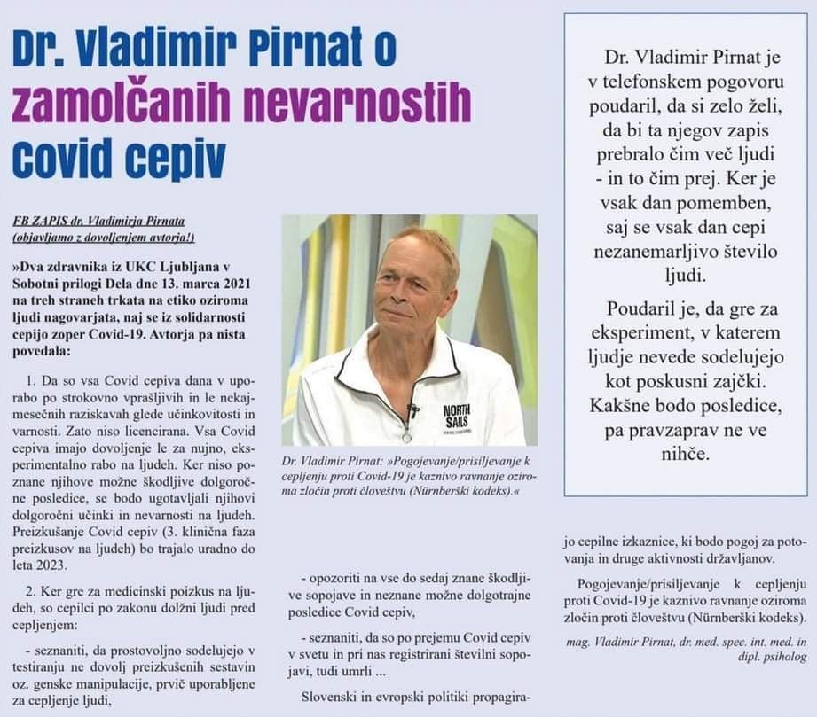 Spoštovani prof.dr. Alojz Ihan, dr.med. V izogib pravnih posledic zaradi morebiti pomanjkljivo informiranih ljudi pred cepljenjem zoper Covid-19, prosim, da seznanite predsednico ter članice in člane Zdravniške zbornice s priloženim sestavkom.