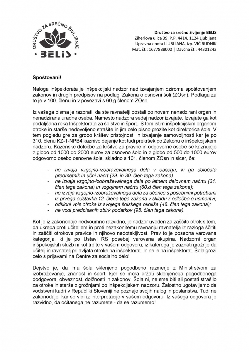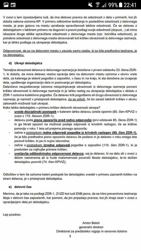 Prav tako je nedopustno, da se odgovornost za ukrepanje zoper tiste, ki bodo zavrnili testiranje, prenaša na ravnatelje. V okrožnici OSNOVNIM ŠOLAM S PRILAGOJENIM PROGRAMOM ZAVODOM ZA VZGOJO IN IZOBRAŽEVANJE OTROK IN MLADOSTNIKOV S POSEBNIMI POTREBAMI OSNOVNIM ŠOLAM Z ODDELKI PRILAGOJENEGA PROGRAMA SOCIALNO-VARSTVENIM ZAVODOM, ki jo je izdalo MIZŠ z dne, 29. 12. 2020, s strani direktorja direktorata za predšolsko vzgojo in osnovno šolo Antona Baloha, je zapisano, da je želeno, da se vsi zaposleni v šolah in zavodih testirajo na okužbo s SARS CoV-2. Pričakujemo, da bo testiranje ostalo neobvezno za vse zaposlene v VIZ.