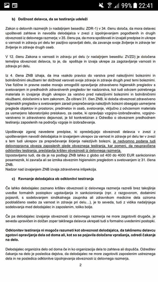 Obveščamo vas, da se s tem številni zaposleni v VIZ ne strinjamo.Obvezno testiranje ne sme in ne more biti pogoj za opravljanje delovnih obveznosti v VIZ brez jasnih epidemioloških in pravnih razlag, da je ta ukrep nujen in v odnosu z drugimi ukrepi za zajezitev širjenja okužb v državi tudi sorazmeren. Zahtevanje in pogojevanje testiranja za zaposlene v VIZ ne omogoča enakosti varovanja ter sistemskega ukrepanja pred širjenjem okužbe s COVID-19 in nas skrbi, da bo ta ukrep prekomeren, celo neustaven za zaposlene in ostale deležnike v VIZ.
