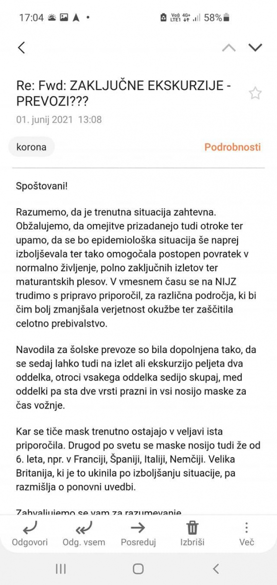iz ministrstva sem prejel odgovor na mojo prošnjo, da mi pokažejo znanstvene študije o VARNOSTI IN UČINKOVITOSTI NOŠENJA MASK PRI OTROCIH. takšno je bilo predpisano navodilo, ki so ga ravnateljicam in ravnateljem poslali z MIZŠ-ja - da morajo otroci pri pouku nositi maske. ker nisem strokovnjak na področju zdravja, epidemij in mikrobiologije, sem kot starš zahteval znanstveno utemeljitev o predpisanem ukrepu - da se kot starš lažje in bolj informirano odločim o tem, ali dovoljujem ta zaščitni medicinski poseg na mojih otrocih