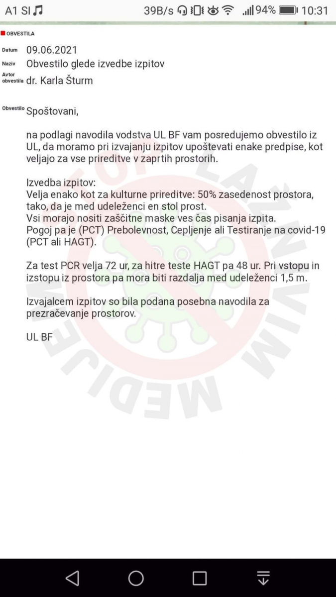 Obenem vam sporočamo, da je vsako pogojevanje izobraževanja z obveznimi hitrimi testi nesprejemljivo tudi za vse učence, dijake in študente.