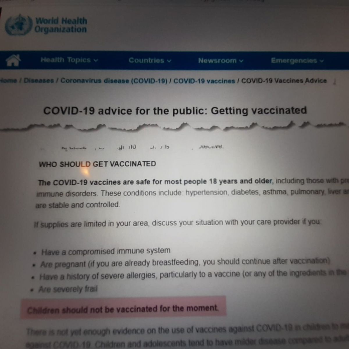 Svetovna zdravstvena organizacija (WHO) je v najnovejši posodobitvi svojih napotkov glede cepljenja zapisala, da ne priporoča oz. odsvetuje cepljenje otrok proti covidu-19