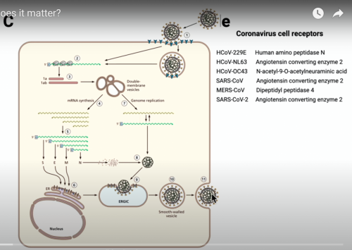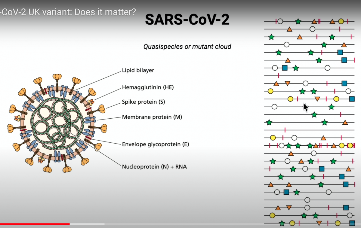 Vsakič ko se virusna RNA replicira znotraj celice, nastane določeno število napak/mutacij. V eni sami celici nastane več tisoč virusov, ki so kolekcija mutantov. Koronavirus SARS CoV-2 ima velik genom- okoli 30.000 genov in vsakič ko koronavirusi pridejo ven iz celice, je med njimi zelo veliko mutantov. To kaže naslednja slika- linije na desni predstavljajo genom koronavirusa SARS CoV-2 in simboli na liniji kažejo različne mutacije.