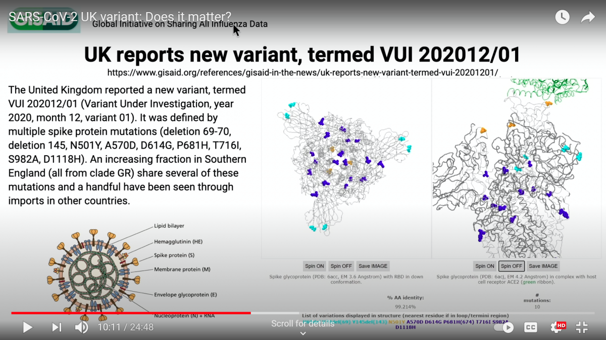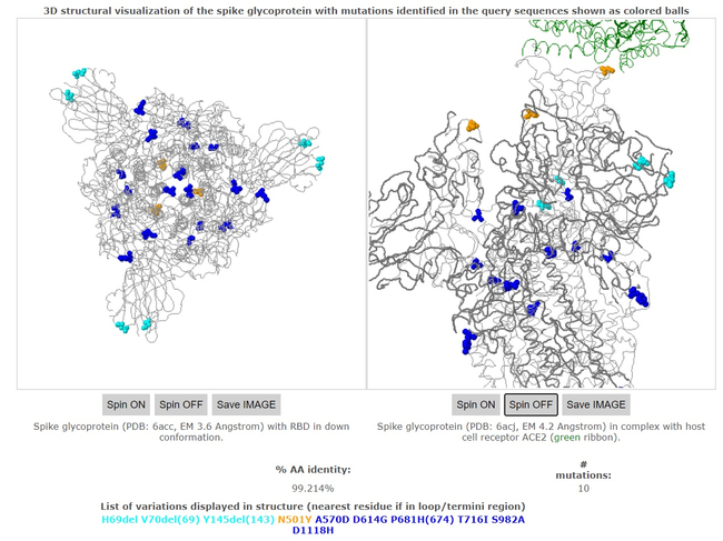 Beljakovinska bodica je zelo pomembna, saj omogoča virusu, da okuži človeške celice. Ima tri polipeptidne verige, ki jih prikazuje zgornja slika. Zelena barva označuje mesta, preko katerih se koronavirus SARS CoV-2 veže na receptorje v membrani človeške celice. Označene so tudi spremembe aminokislin. Ena izbrisana aminokislina je na mestu vezave virusa, zato se lahko sprememni moč vezanja. najbolj pomembna sprememba je verjetno v aminokislini N501Y (oranžne barve), na mestu vezave na človeško celico in vezave protitelesa. Druge mutacije aminokislin so manj pomembne. Izbris ORF8 beljakovine se je zgodil že prej tudi v Singapurju, kar je precej oslabilo patogenost (virulenco) virusa, vendar mediji o tem nikoli ne poročajo. Nikakor ne moremo zaključiti, da se nova inačica koronavirusa SARS CoV-2 hitreje širi kot prejšnje.